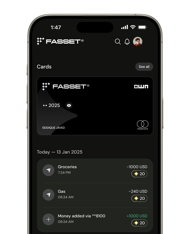 The Fasset Virtual Card is a prepaid digital card which you can top up in USDT, which then lets you spend your crypto balance seamlessly, just like a regular card, wherever the card network, VISA, is accepted. Card currency is USD. It is “virtual,” meaning there is no physical plastic card (Physical card is targeted for launch tentatively in Q1’26)
